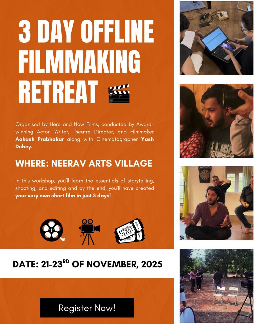 Escape to the peaceful Neerav Arts Village for a 3-day immersive filmmaking retreat with award-winning filmmaker Aakash Prabhakar and cinematographer Yash Dubey.